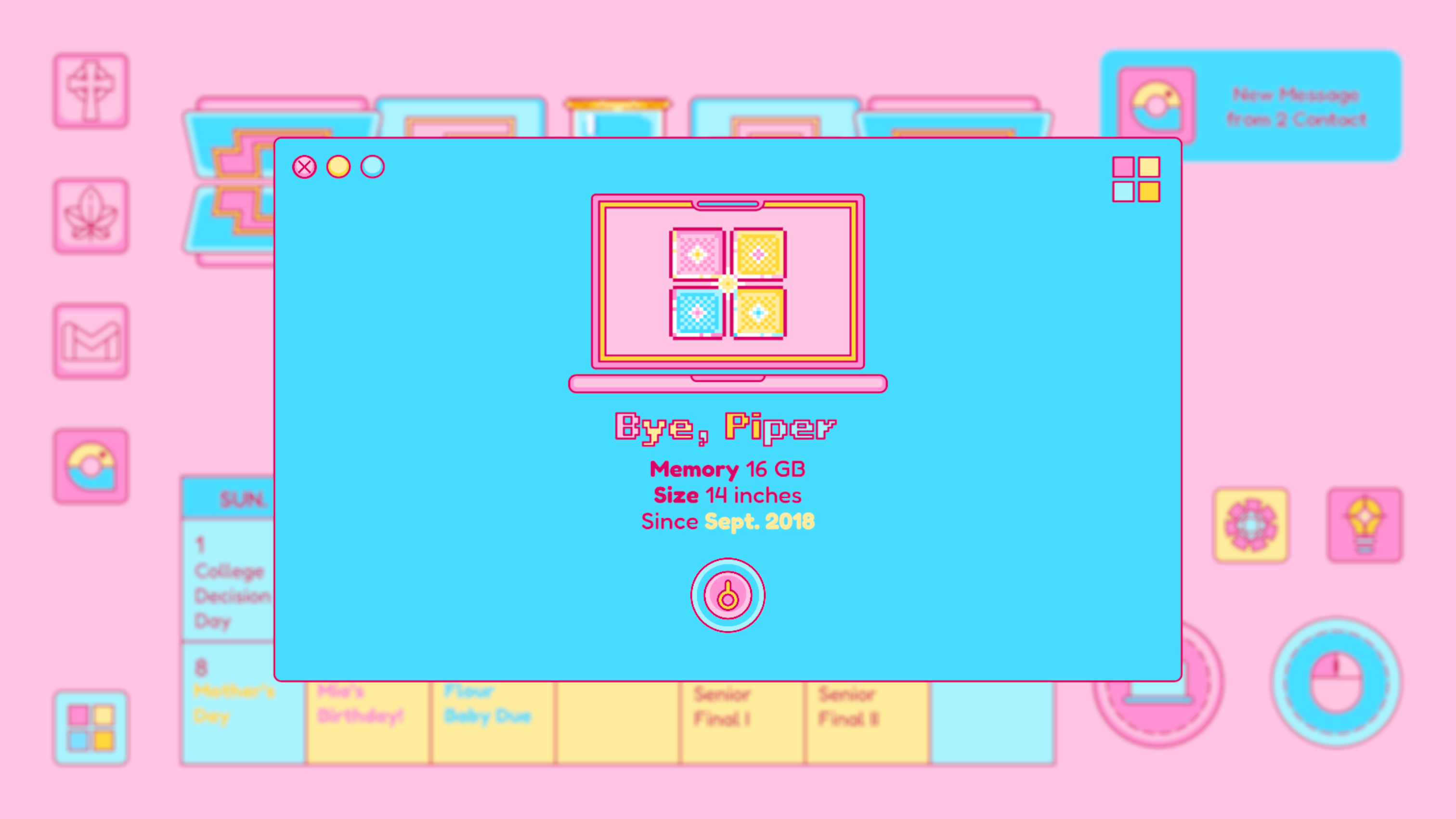 You are Piper's—a graduate from a Catholic all-girls high school—laptop for 4 years. After experiencing an intense senior year with mixed feelings, your usage life will finally enter the end at the time of 6: 24 AM of May 29th, 2022. However, instead of just waiting through the garbage time, you get a chance to use up your last power in the freeze moment of 5:03 AM to save all the data of memories for Piper before she drives to the new chapter of her life.